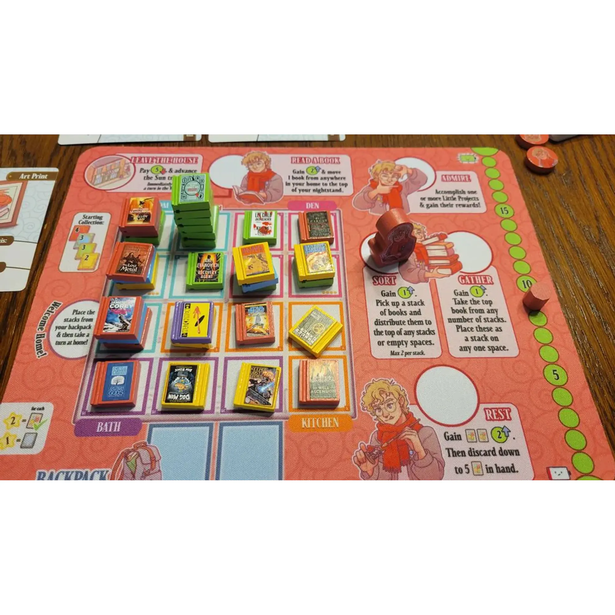 The game combines puzzle and worker placement mechanics. Players arrange books according to project cards that set conditions (e.g., specific colors in rooms, a certain number of books in a stack). The bookstore, library, and shops offer new books, extra project cards, and special items that provide bonuses or points. Each visit consumes energy and time (represented by sunlight), creating tense decisions about when to stay home and when to go out. Projects grant Victory Points, extra rewards, and items. The game lasts nine rounds, and the player with the most points wins.