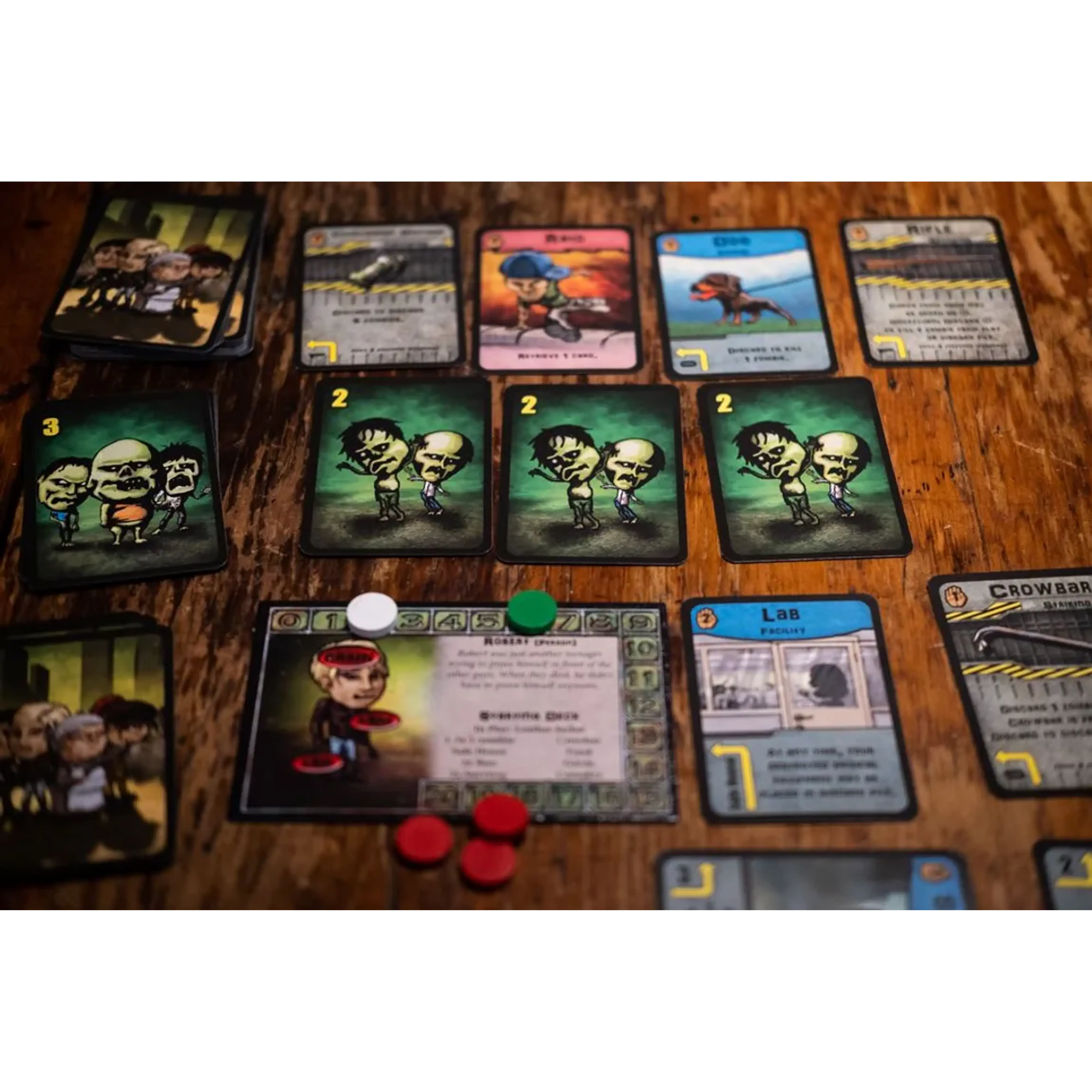 Your deck is invaded by more zombies each time it is reshuffled, so you need to search the area deck for useful weapons and other things to help you. Some stuff can be added to your deck while others will stay in your play area, and still other things will be usable only once in the game. To manage your deck and play area well is critical if you are to complete the mission before you are overwhelmed by the zombies!