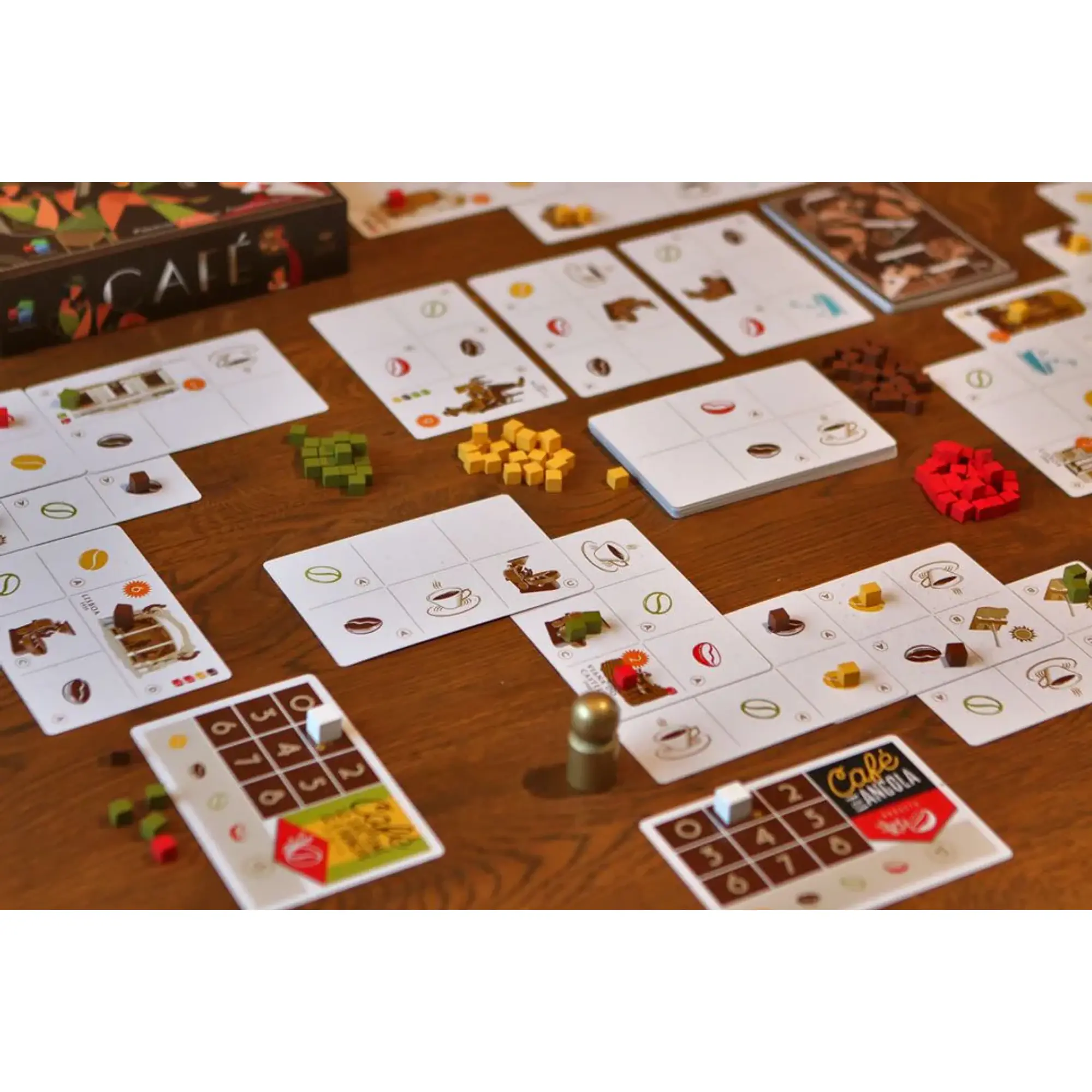 In Café, 1 to 4 players represent coffee companies that from plantation, drying, roasting and distribution try to create and control the best supply chain of coffee.