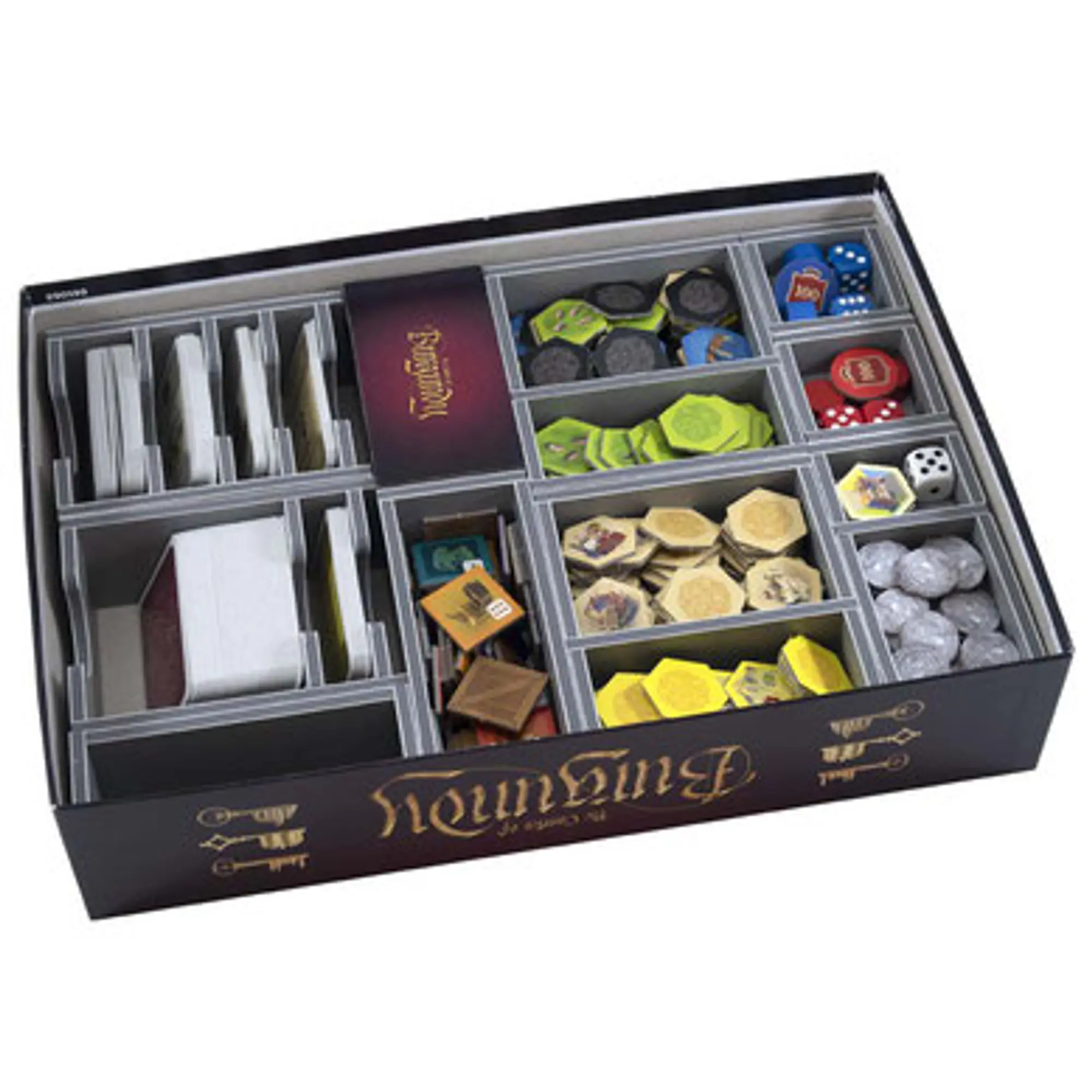 Insert compatible with Castles of Burgundy: Anniversary Edition®, and also has trays for The Card Game® version. The design provides both efficient storage and improved game play. The trays can be utilised during the game, and they greatly aid set-up and clear-away times. The rules and boards act as a lid on top of the trays.