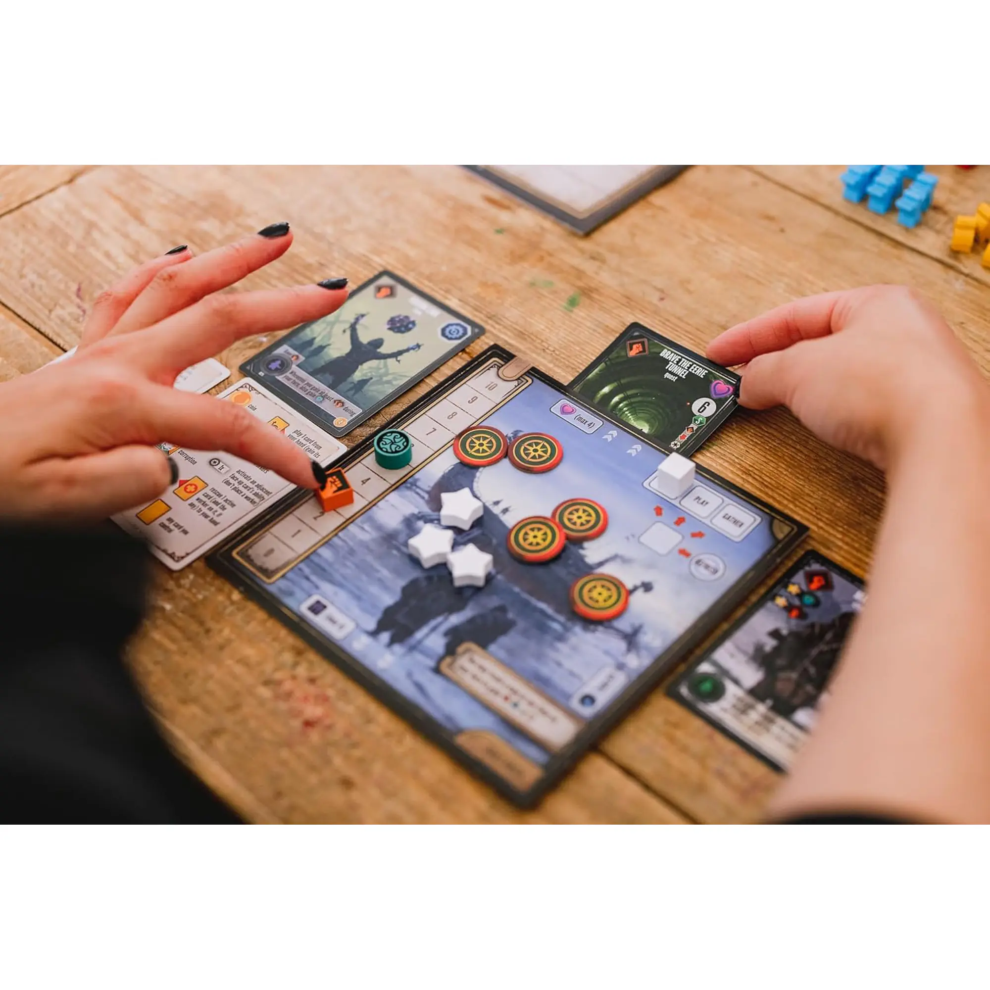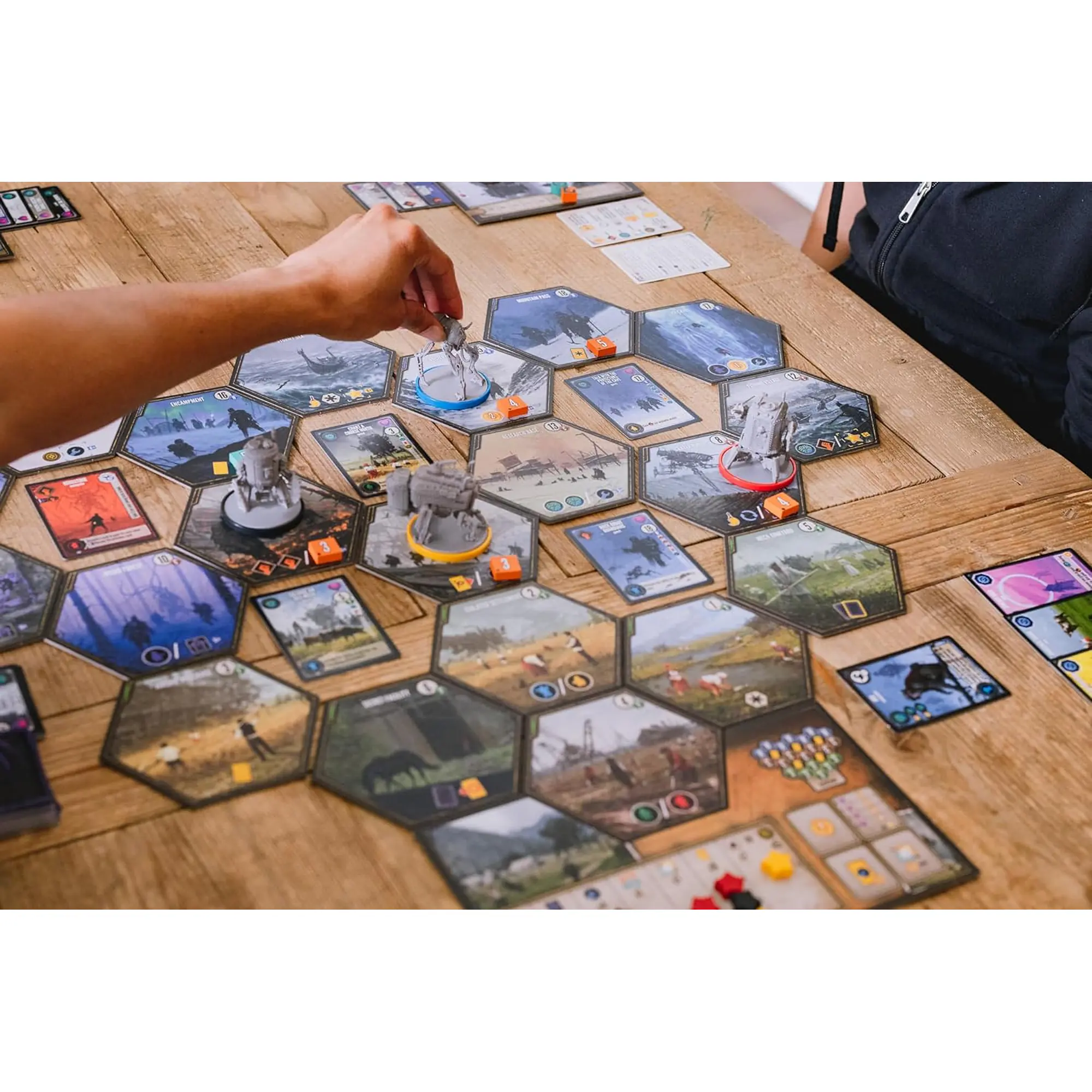 GAMEPLAY: Play cards to gain power, guile, and unique worker abilities; move your mech to mysterious locations and gain cards found among the tiles; use workers, items, meteorites, and quests to enhance your mech; and use power and guile to vanquish corruption.