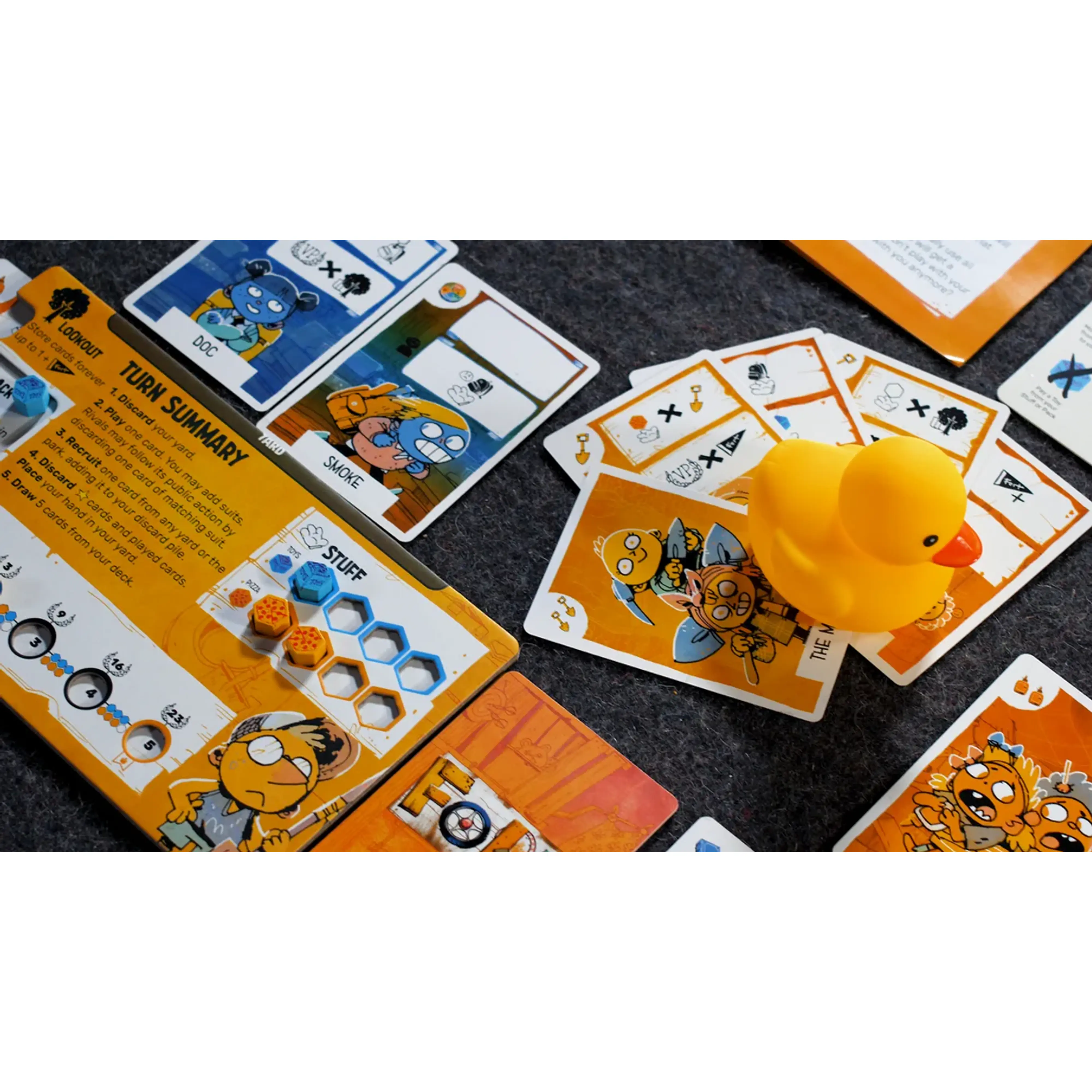 By doing this cool stuff, you'll score victory points, and at the end of the game, the player with the most victory points wins! Your cards not only let you take actions on your own turn, but also let you follow the other players' actions on their turns. Will you devote yourself to your own posse, or copy what the other kids are doing?