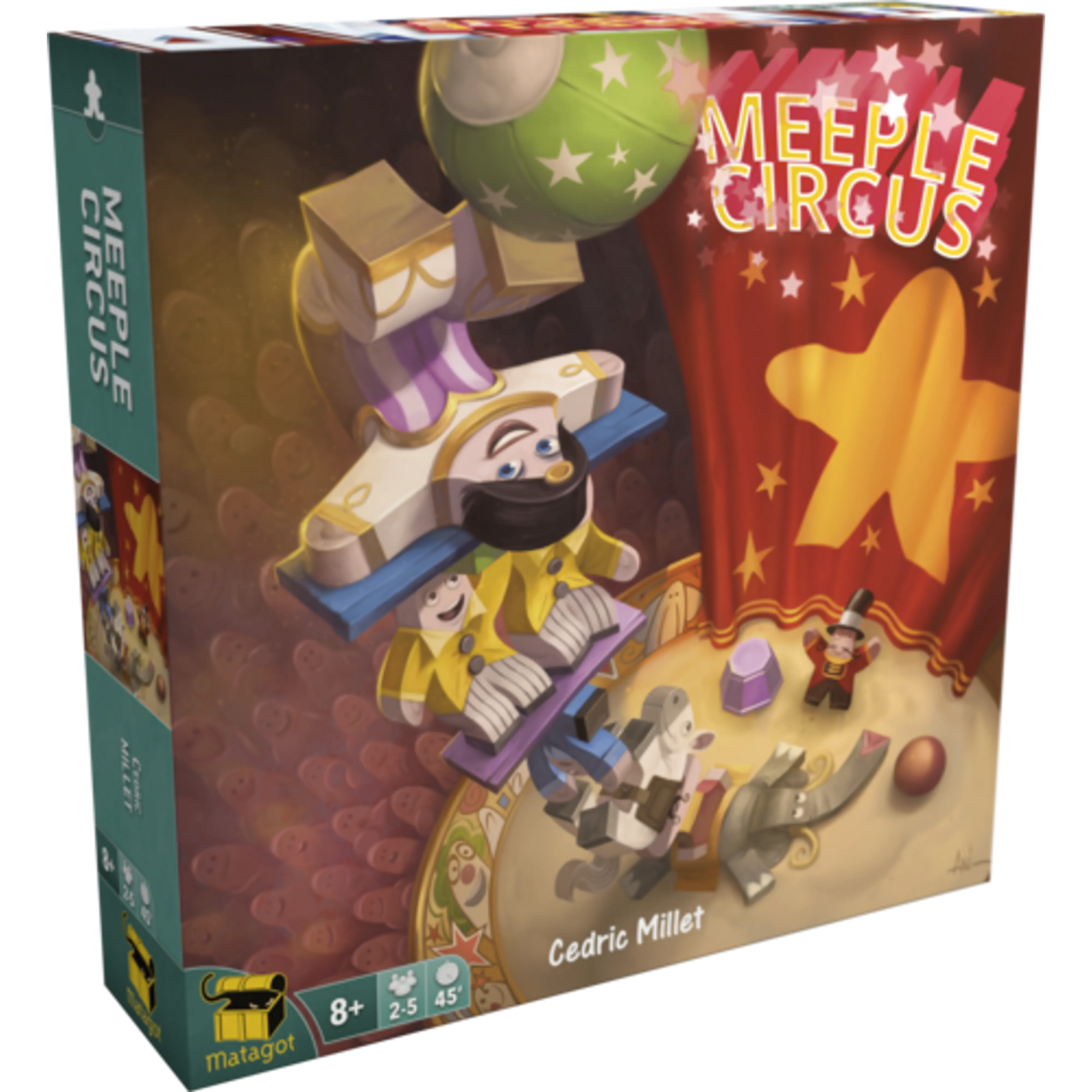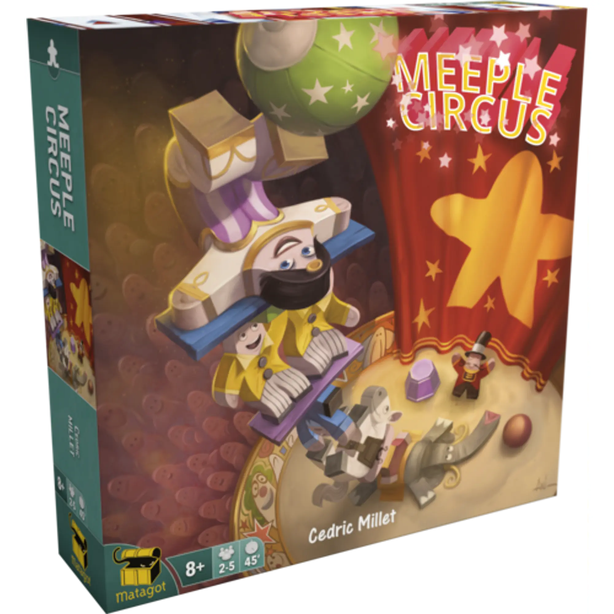Be sure to undertake a good rehearsal, then with your remarkable dexterity, you can give them the show of their lifetime. Once the circus music starts, all eyes will be upon you! In short, Meeple Circus is a dexterity game in which you do what all gamers do when setting up a game: Pile up your meeples!