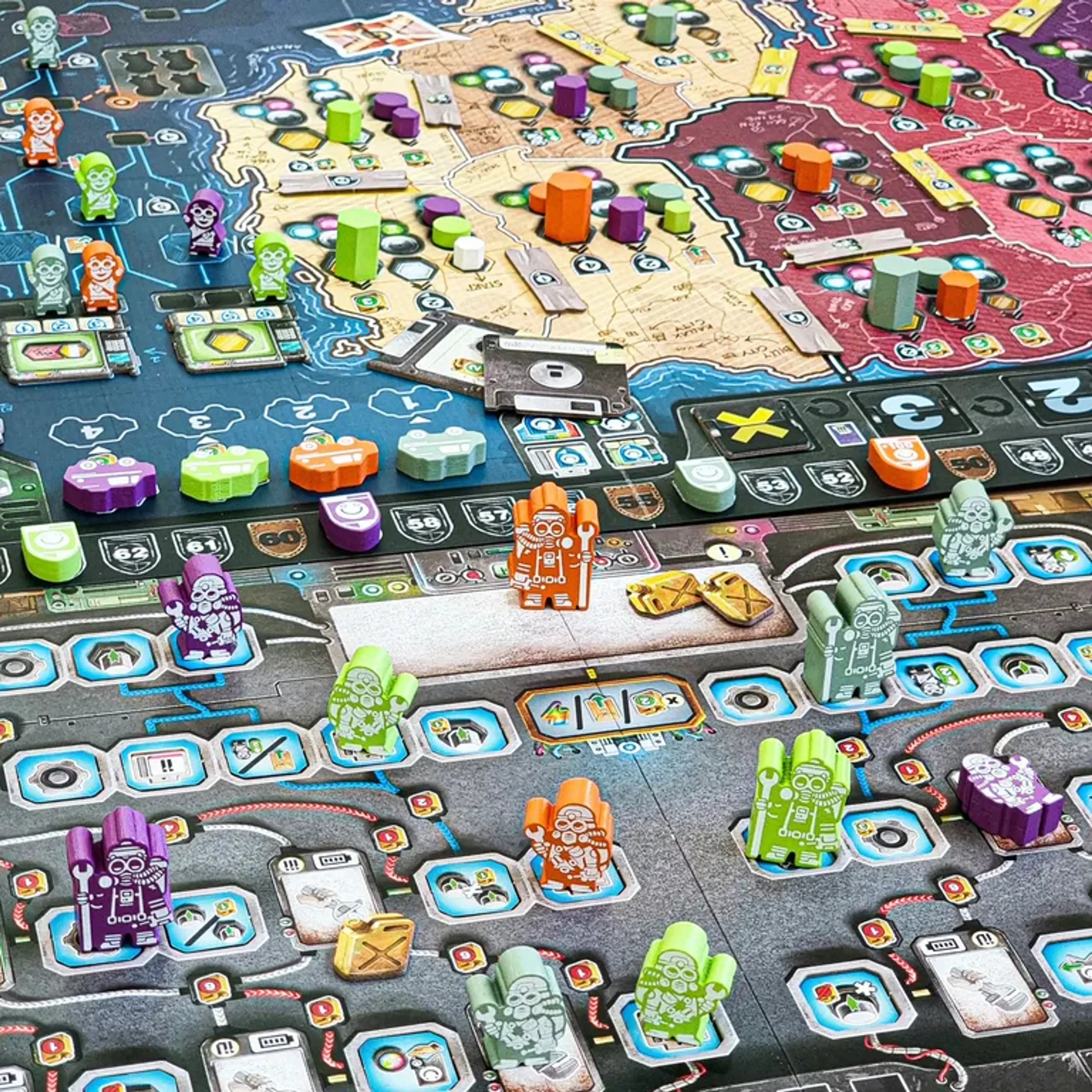 Each player manages a team of three commandos (two basic and one leader), which can gradually be specialized for stronger actions but with less flexibility. On the central board, you build regenerators that allow the construction of buildings and population growth. Completing missions grants extra actions and points. The game includes development tracks, energy management, action combinations, and competition for limited spaces on the map. It is played over four rounds, with most points scored during final scoring through buildings, population, and objectives.