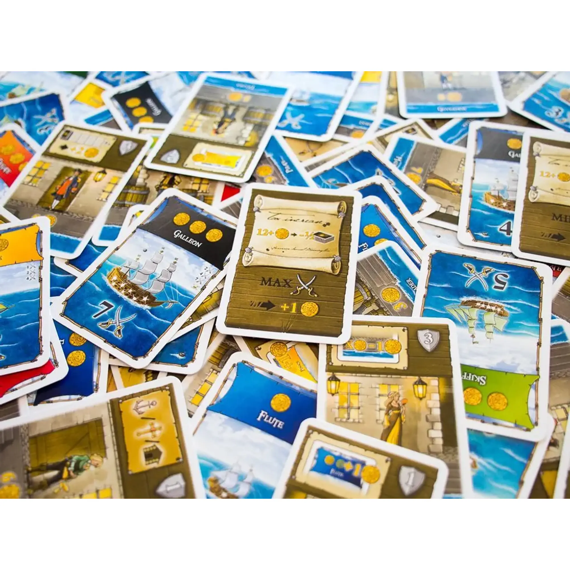 If the player draws a ship with the same name as a ship already in the harbor, he's spent too much time dilly-dallying and his turn ends (after using the ship to attack, if possible), with all the cards in the harbor being discarded. Otherwise, the player can stop whenever he likes, then use/acquire one card if three or fewer ships are in the harbor, two cards if four ships are present, and three cards if five ships are present. Players rob ships, collecting the number of coins shown on them, then discarding the card, while they hire people, paying the number of coins depicted. After the active player takes his 1-3 cards, each other player may pay the active player one coin in order to take one card in the same way.