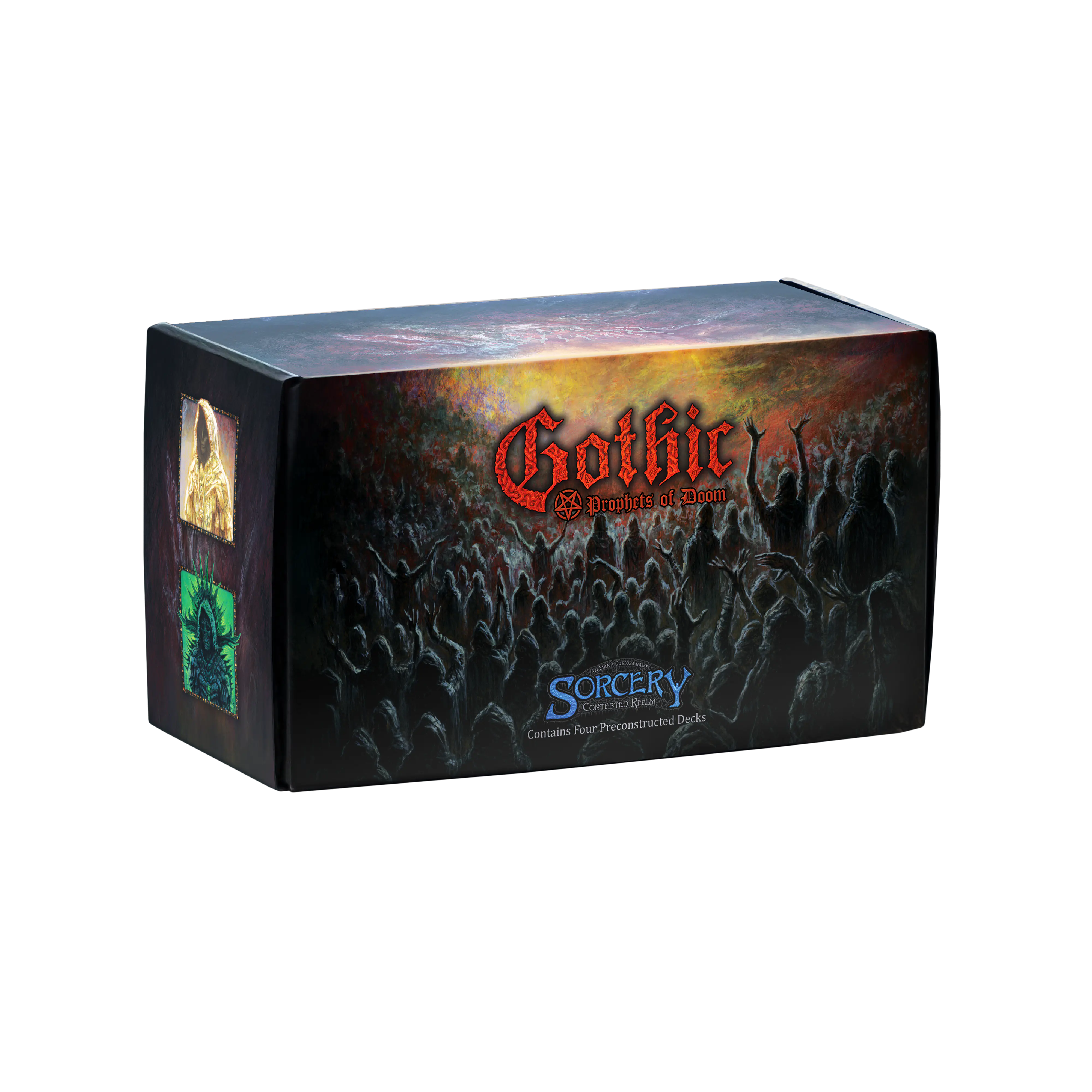 This is a box containing 4 preconstructed Gothic decks called Prophets of Doom, which are part of the Gothic expansion for the game Sorcery: Contested Realm. They are intended for: