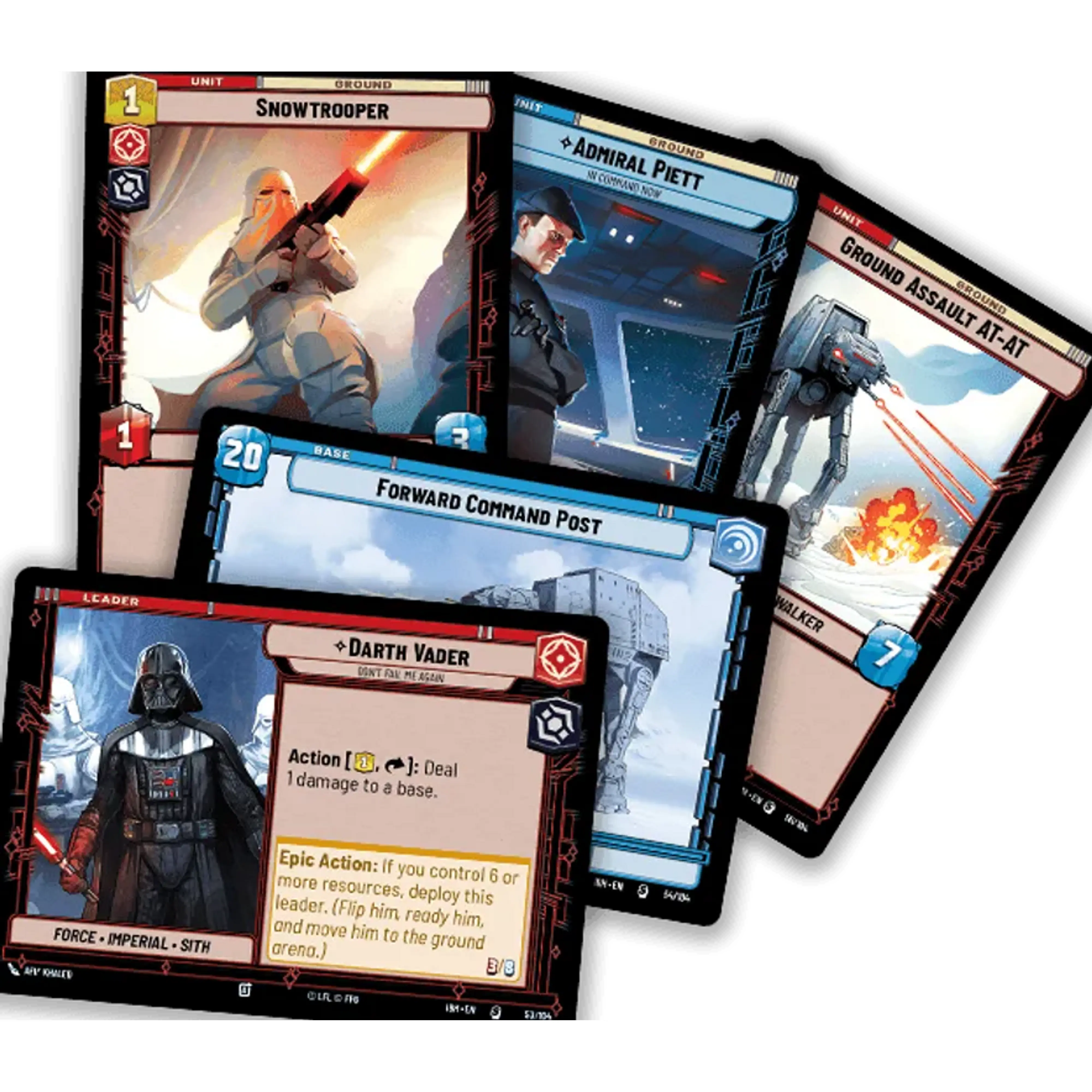 The game takes you into the legendary Battle of Hoth from the Star Wars saga. You take on the role of Darth Vader, leading the invasion of Echo Base, or Leia Organa, commanding the Rebel forces in a desperate defense. This is a standalone set designed as an introduction to Star Wars: Unlimited, making it perfect for beginners and fans of the Star Wars universe. It features iconic characters, units, and moments from the Battle of Hoth, creating an authentic cinematic atmosphere.