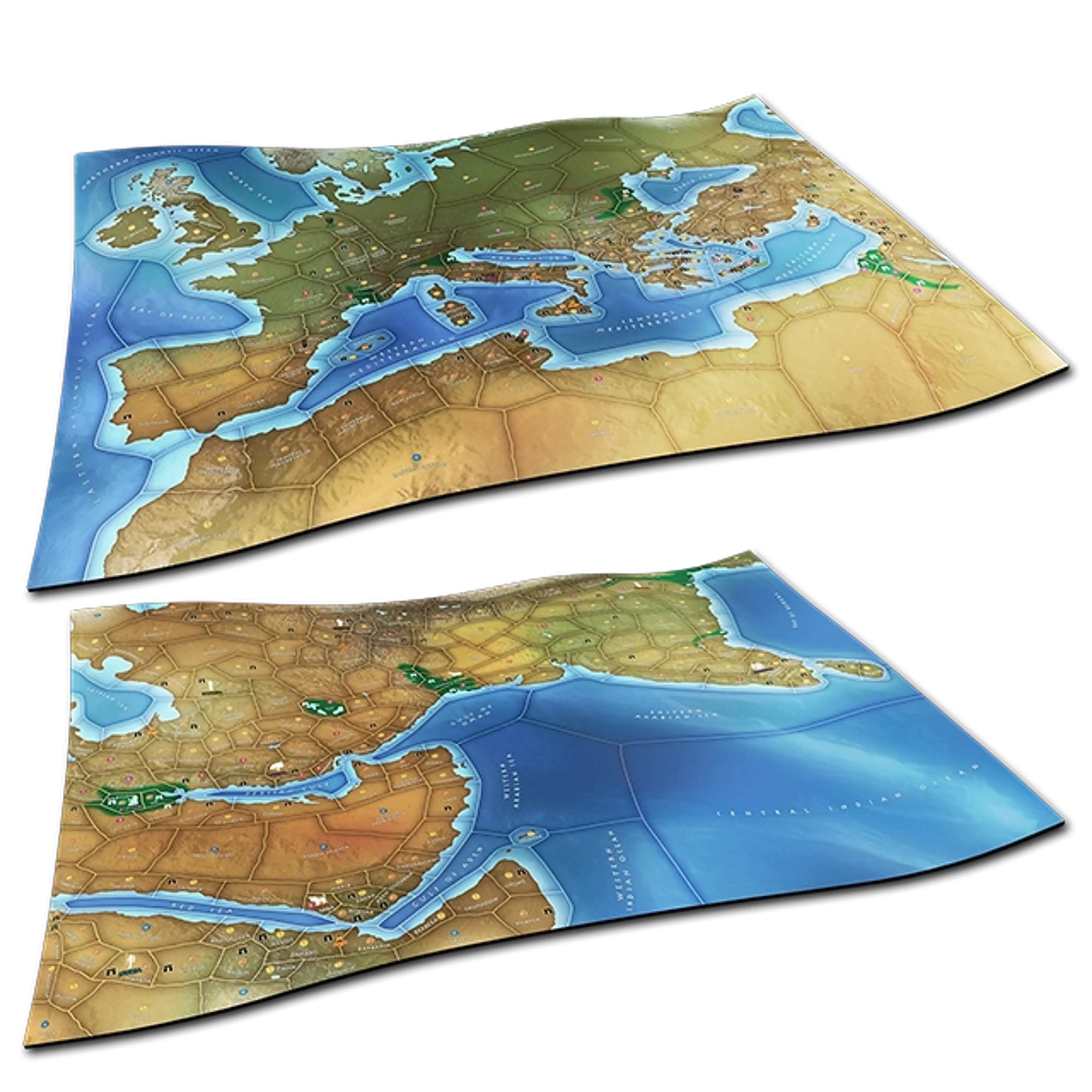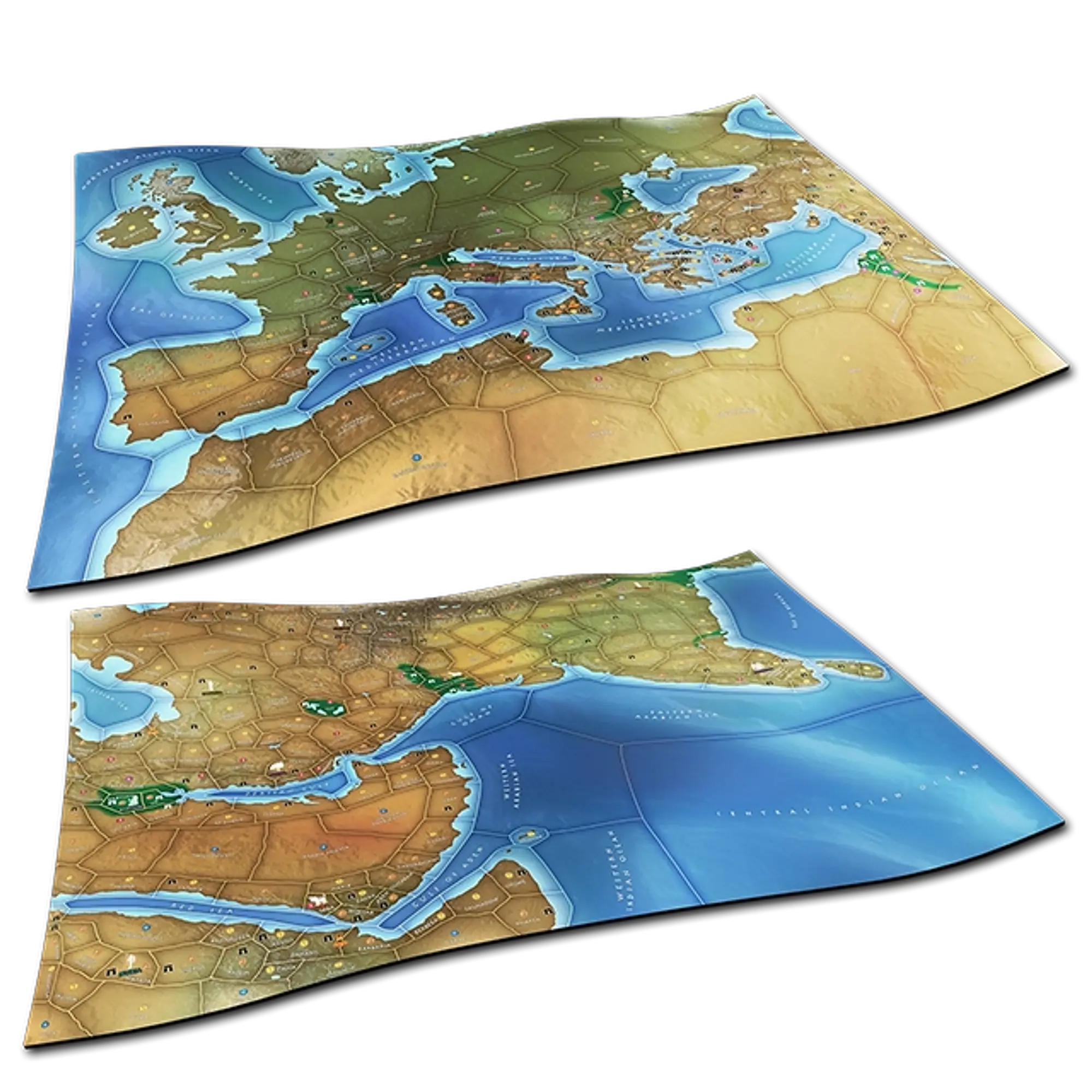 Deluxe Game Mat – THE WEST & THE EAST sta vrhunski igralni podlogi, zasnovani kot dodatka za strateško družabno igro Mega Empires. Vsaka podloga predstavlja polovico sveta – zahodno ali vzhodno – in omogoča igralcem poglobljeno izkušnjo v razvoju civilizacij skozi 8000 let zgodovine.
