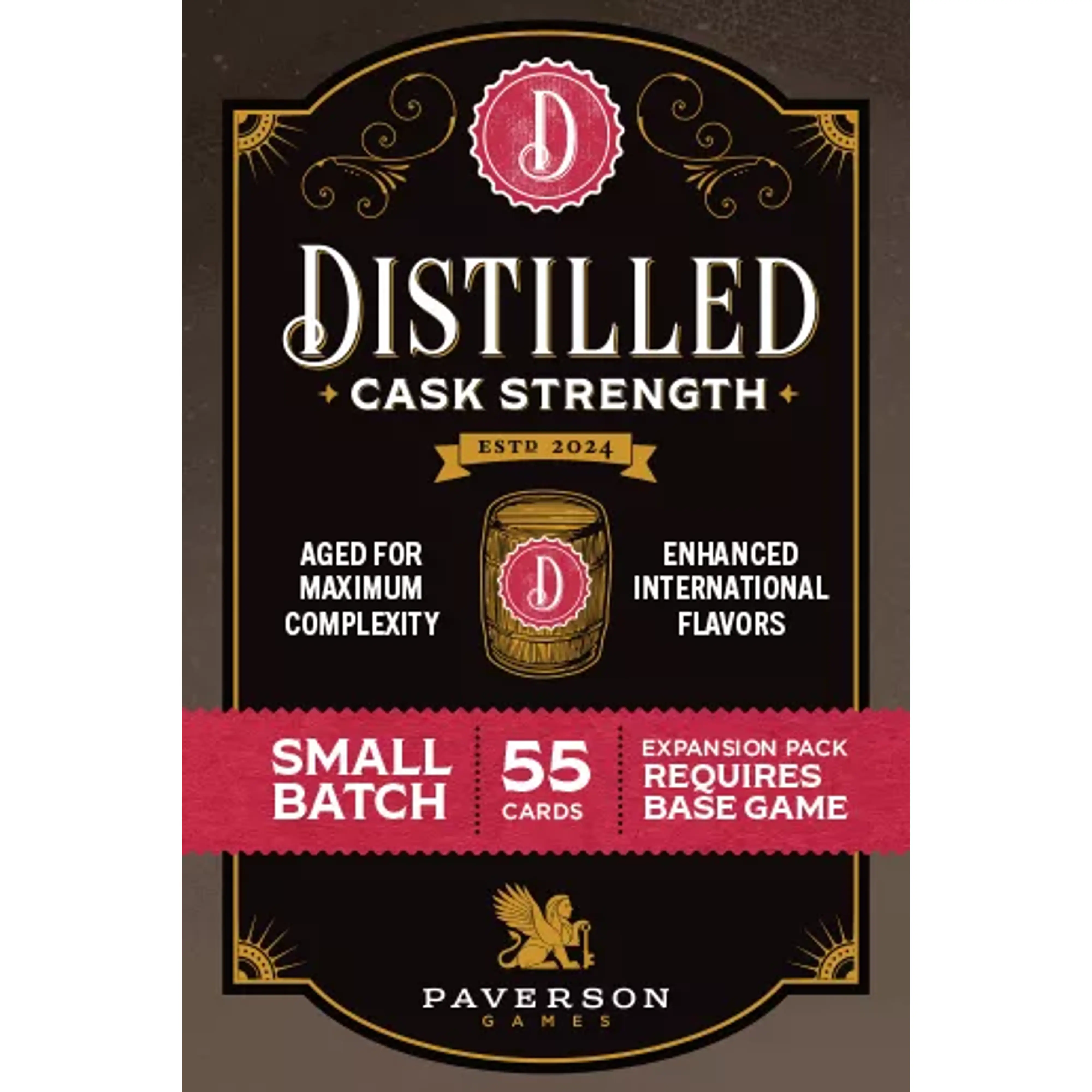 Cask Strength je mini razširitev za igro Distilled, zasnovana z namenom dodati več globine in raznolikosti. Razširitev vključuje štiri dele: nove nadgradnje destilarne, posebne okuse, nadgrajene vrhunske sestavine in razburljiv nov mehanizem dinamičnega trga. Gre za majhno škatlo, ki prinaša veliko vsebine!