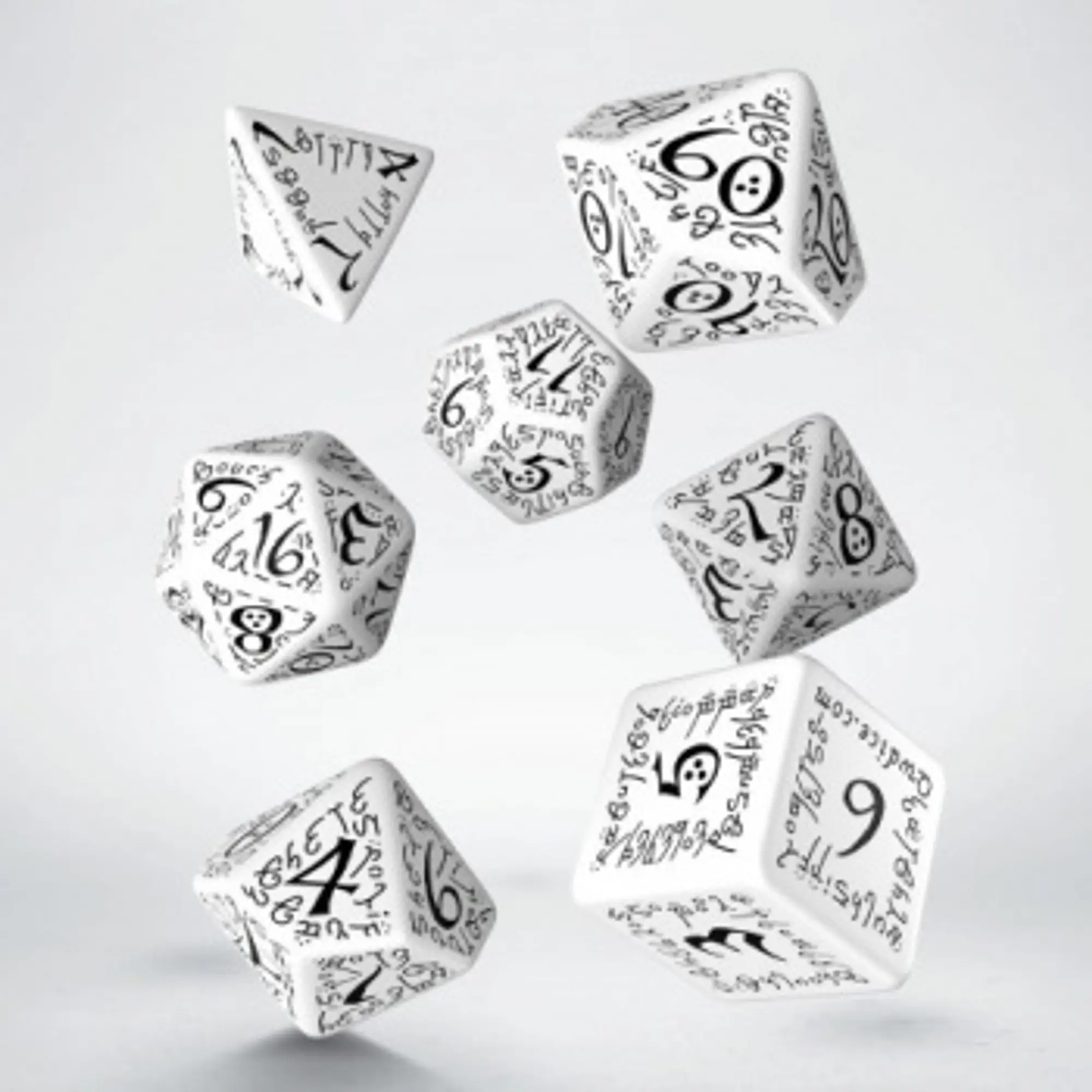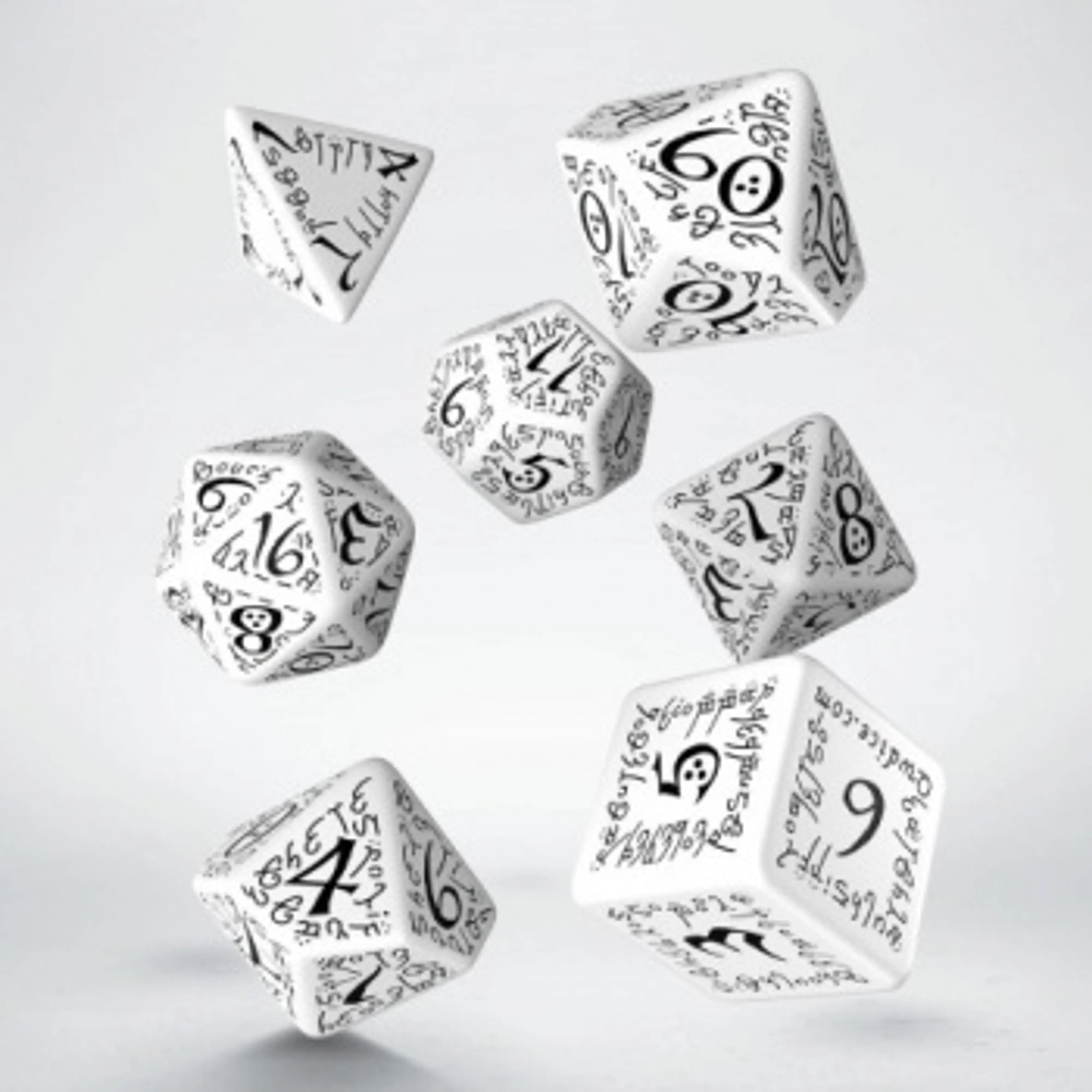 Elvish White & Black Dice Set, “glân ar môr”, je odličen komplet za sanjače, ki želijo uporabljati kocke, ki spominjajo na bele snežne ravnice z visokimi vrhovi in skalami.