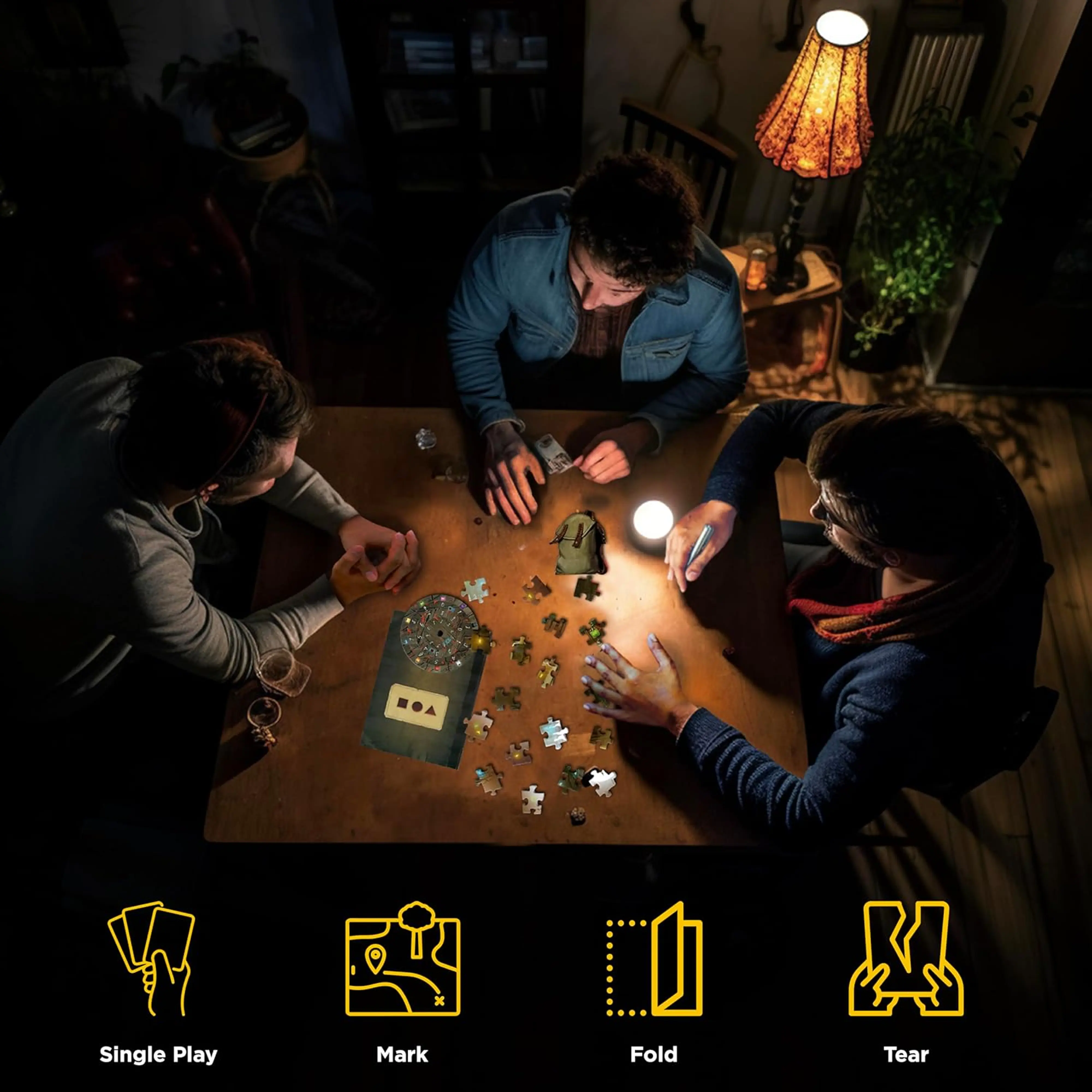 Deli sestavljank se uporabljajo kot ključi ali namigi, kar ustvarja edinstveno interaktivno izkušnjo. Igra je idealna za skupinsko igranje, saj spodbuja komunikacijo in skupno reševanje.🕯️🔎🏚️