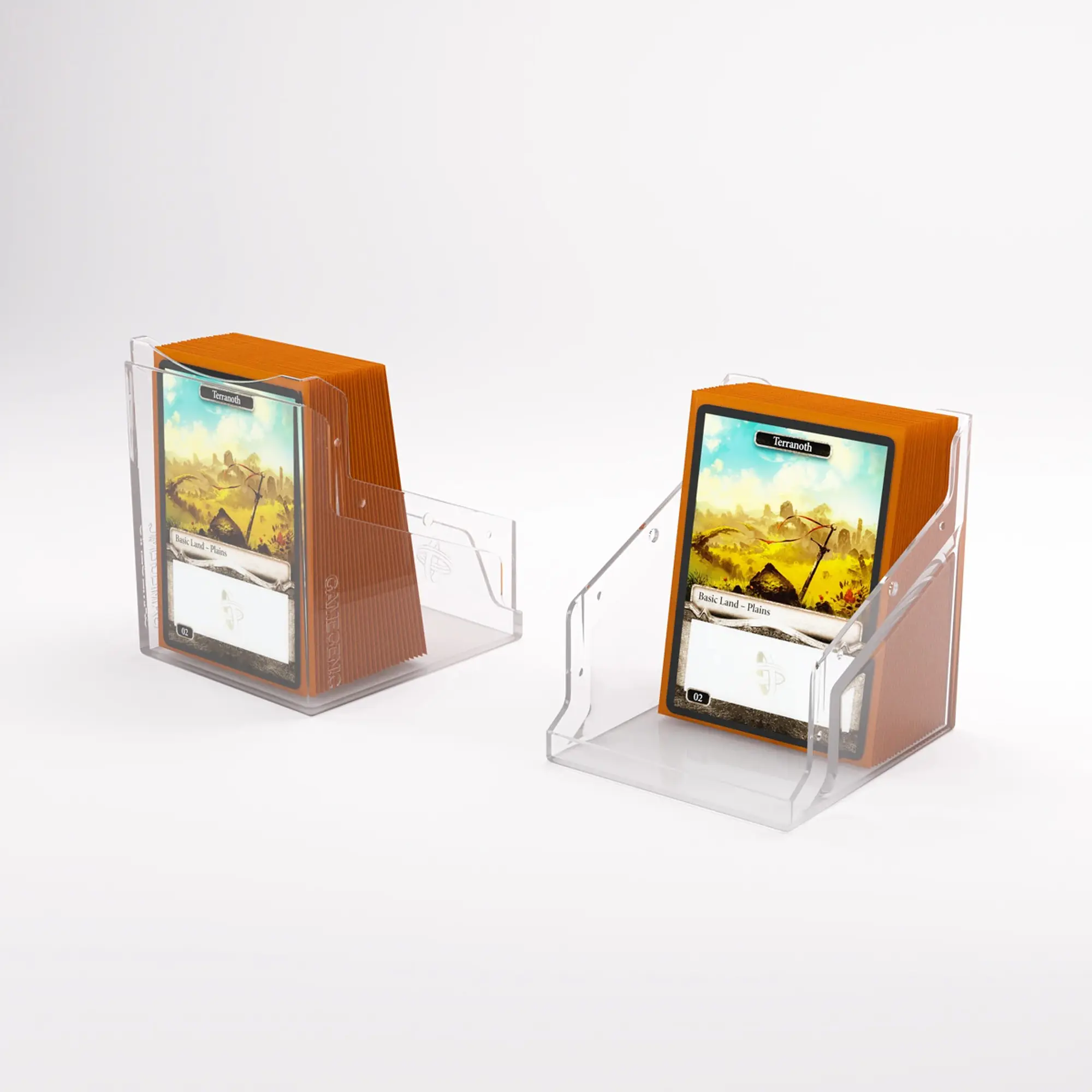 Bastion 100+ XL je izjemno kompaktna in trdna škatla za karte, zasnovana za varno shranjevanje več kot 100 dvojno ovitih kart v debelih notranjih ovitkih (Thick Inner Sleeves). Zaradi prosojnih materialov in pametne postavitve zapiralnih zavihkov je zgornja ali poveljniška karta (Commander) popolnoma vidna od zunaj, brez potrebe po odpiranju škatle.
