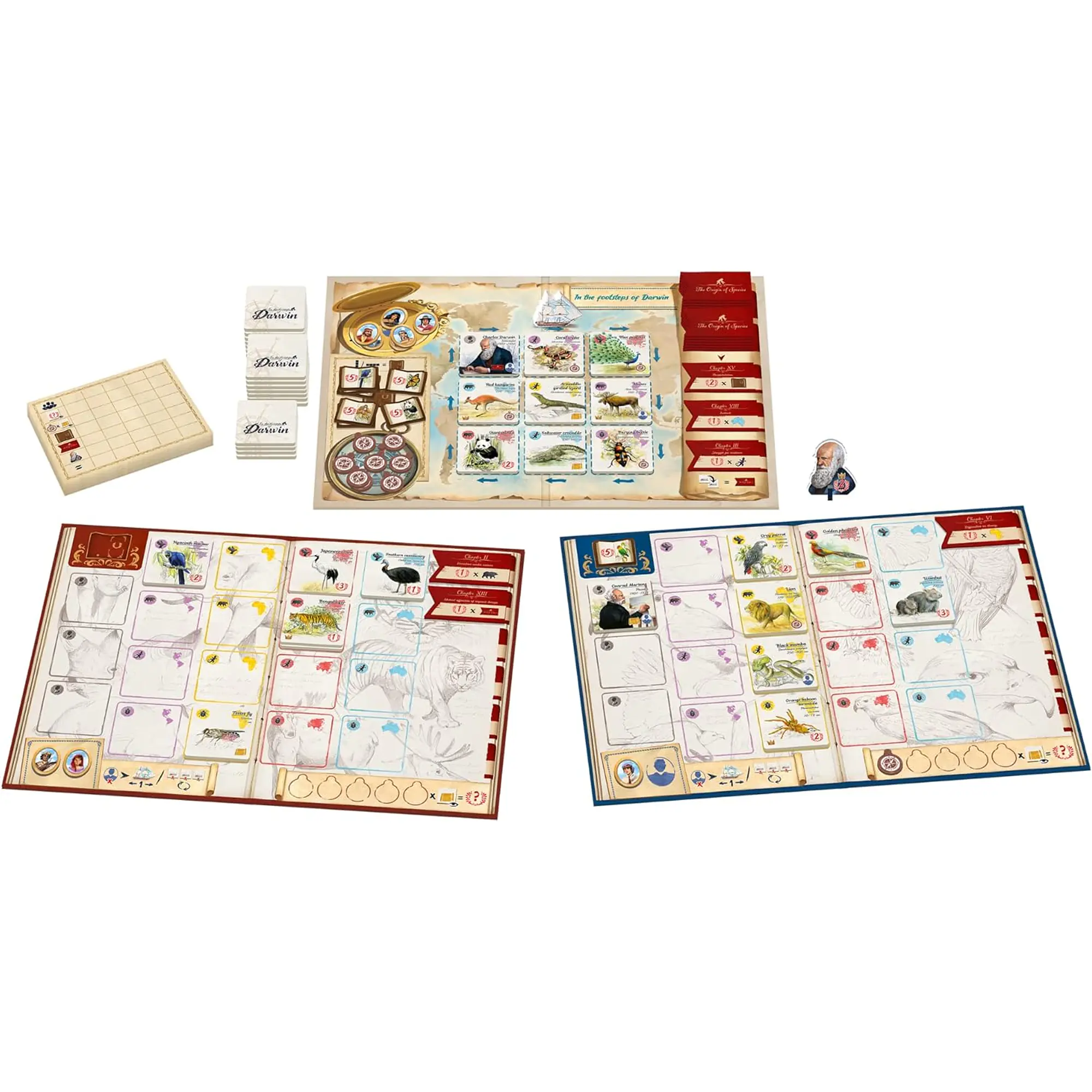 In the Footsteps of Darwin je prijetna in vizualno privlačna družabna igra, ki igralce popelje v obdobje po Darwinovem znamenitem potovanju z ladjo HMS Beagle. Igro je izdala založba Sorry We Are French, zasnovana pa je kot lahka strateška igra z mehaniko draftanja ploščic, primerna za 2 do 5 igralcev, starejših od 8 let.
