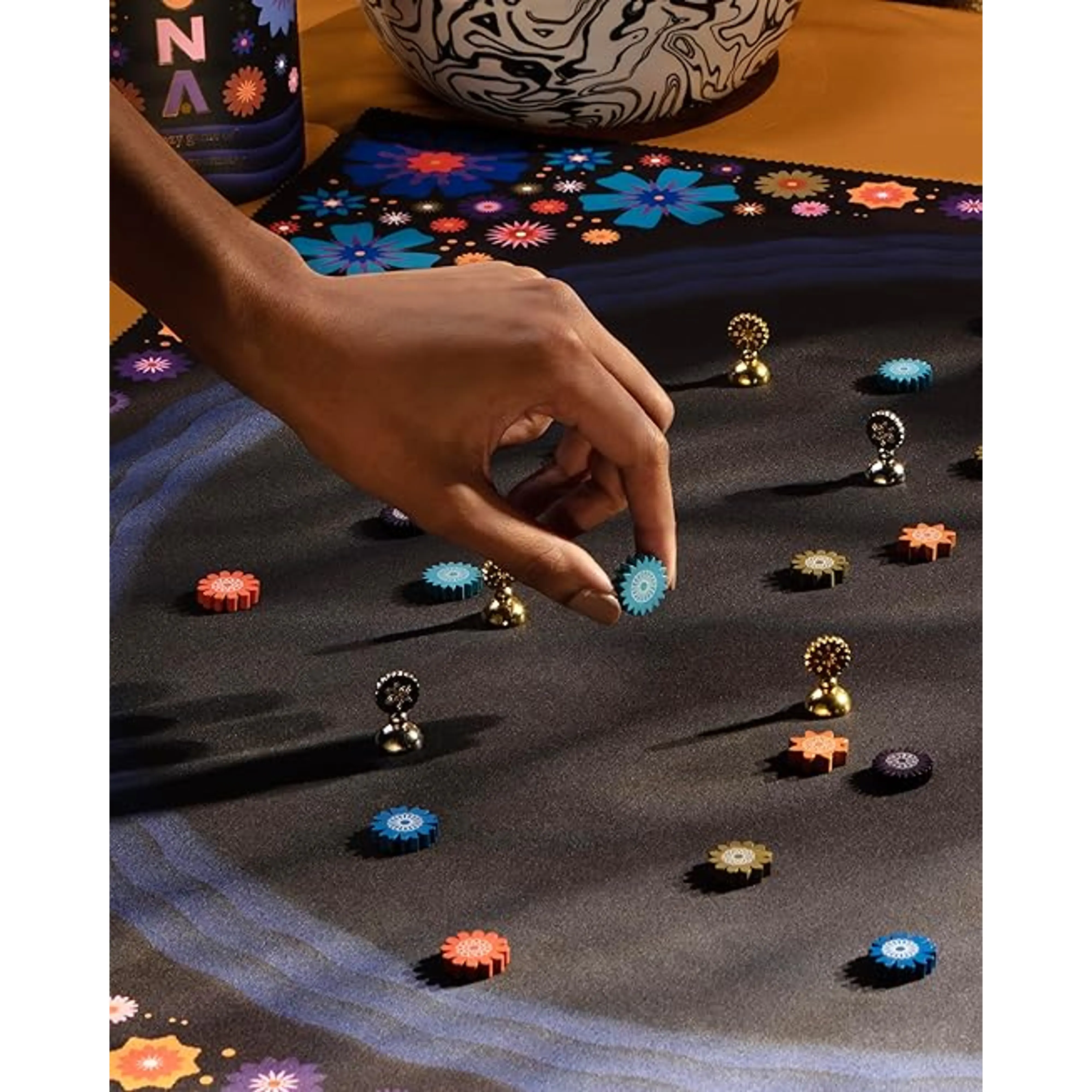 Igralno površino (tkanino) razgrneš, nato iz valjaste škatle stresaš 49 lesenih cvetnih žetonov v naključnem vzorcu.