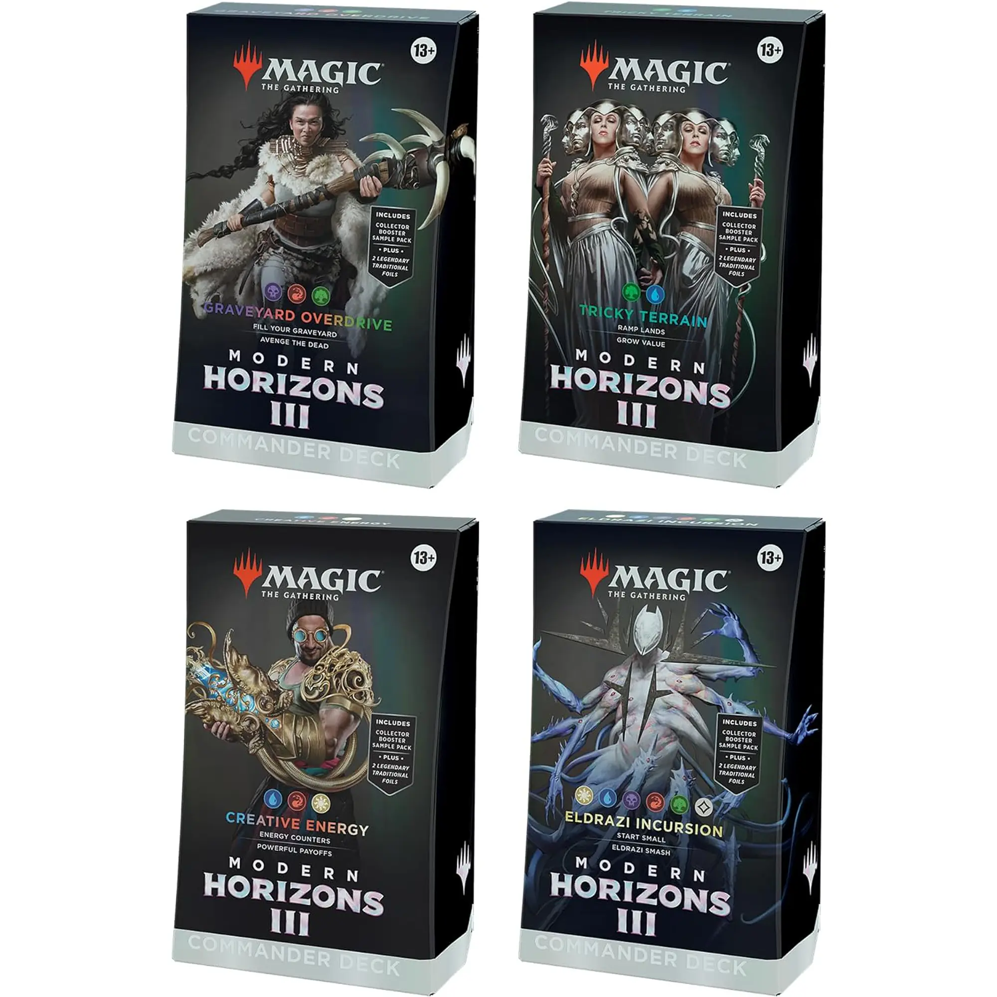 Vsebuje 4 Commander komplete iz seta Modern Horizons 3; vsaka 100-kart v decku vključuje tudi: