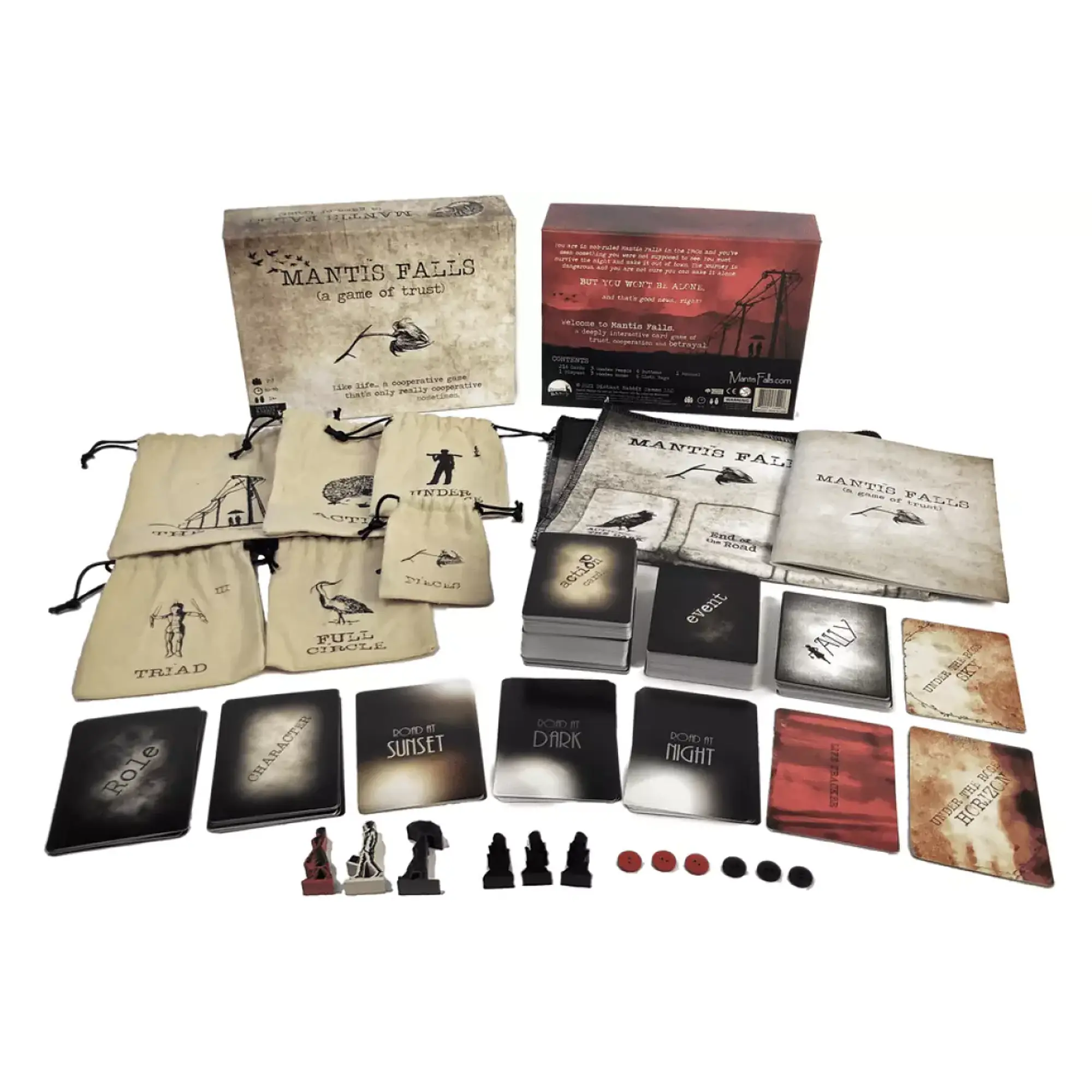 MANTIS FALLS je izjemno napeta in tematsko bogata družabna igra za 2–3 igralce, ki združuje skrivne vloge, upravljanje s kartami in psihološko napetost v slogu noir kriminalke iz 1940-ih. Igra je zasnovana kot "igra zaupanja", kjer nikoli ne veš, ali je tvoj soigralec res tvoj zaveznik… ali pa te bo ob prvi priložnosti izdal.