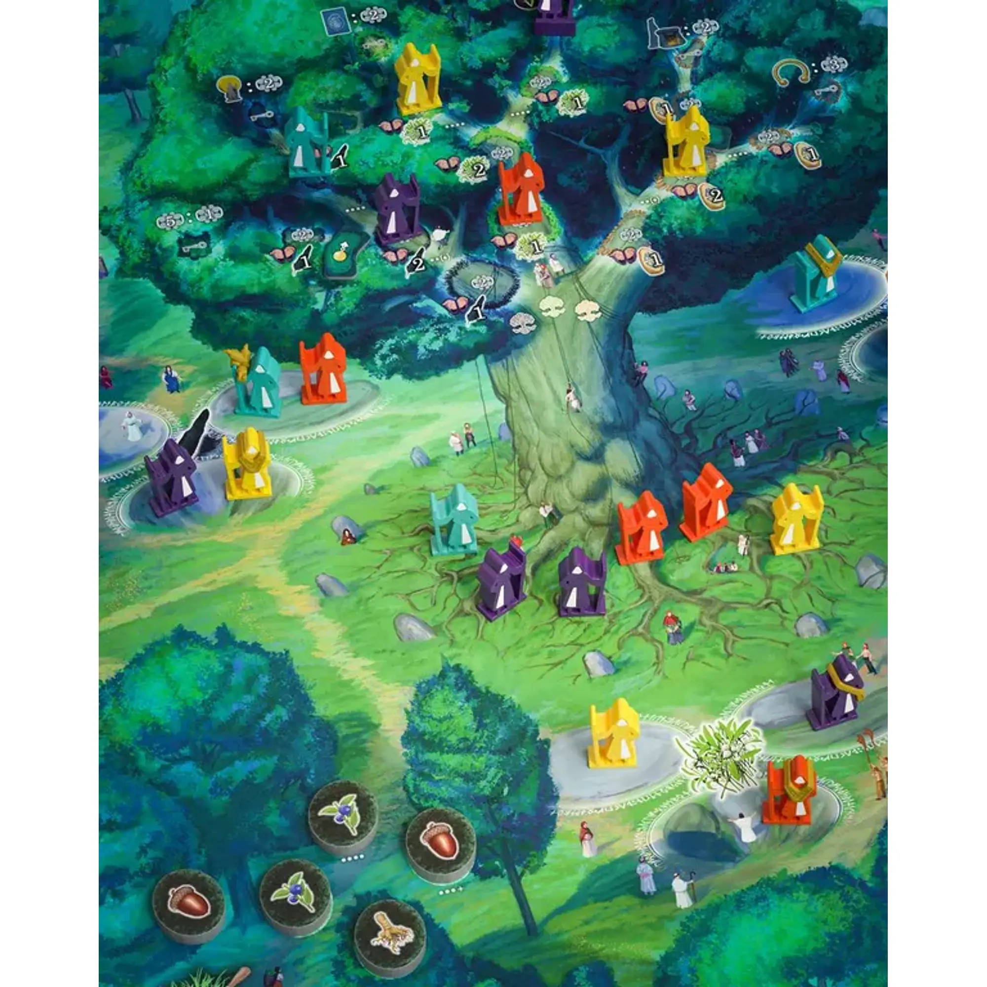 Igralci postavljajo svoje druide na različna mesta okoli Arch-Oaka, da izvajajo dejanja, pridobivajo vire ali sprožijo posebne učinke. Aktivne delavce uporabiš za takojšnja dejanja, pasivni pa prinašajo prednosti ob koncu runde — to doda zanimiv sloj načrtovanja. Druidi se lahko nadgrajujejo z različnimi elementi, ki jim izboljšajo sposobnosti, kar omogoča ustvarjanje močnih kombinacij. Igralci zbirajo karte urokov, artefakte, svete kraje, monolite in bitja, s katerimi širijo svoj vpliv. S pošiljanjem druidov na veje drevesa pridobivajo točke in posebne nagrade, kar predstavlja enega najbolj prepoznavnih elementov igre.
