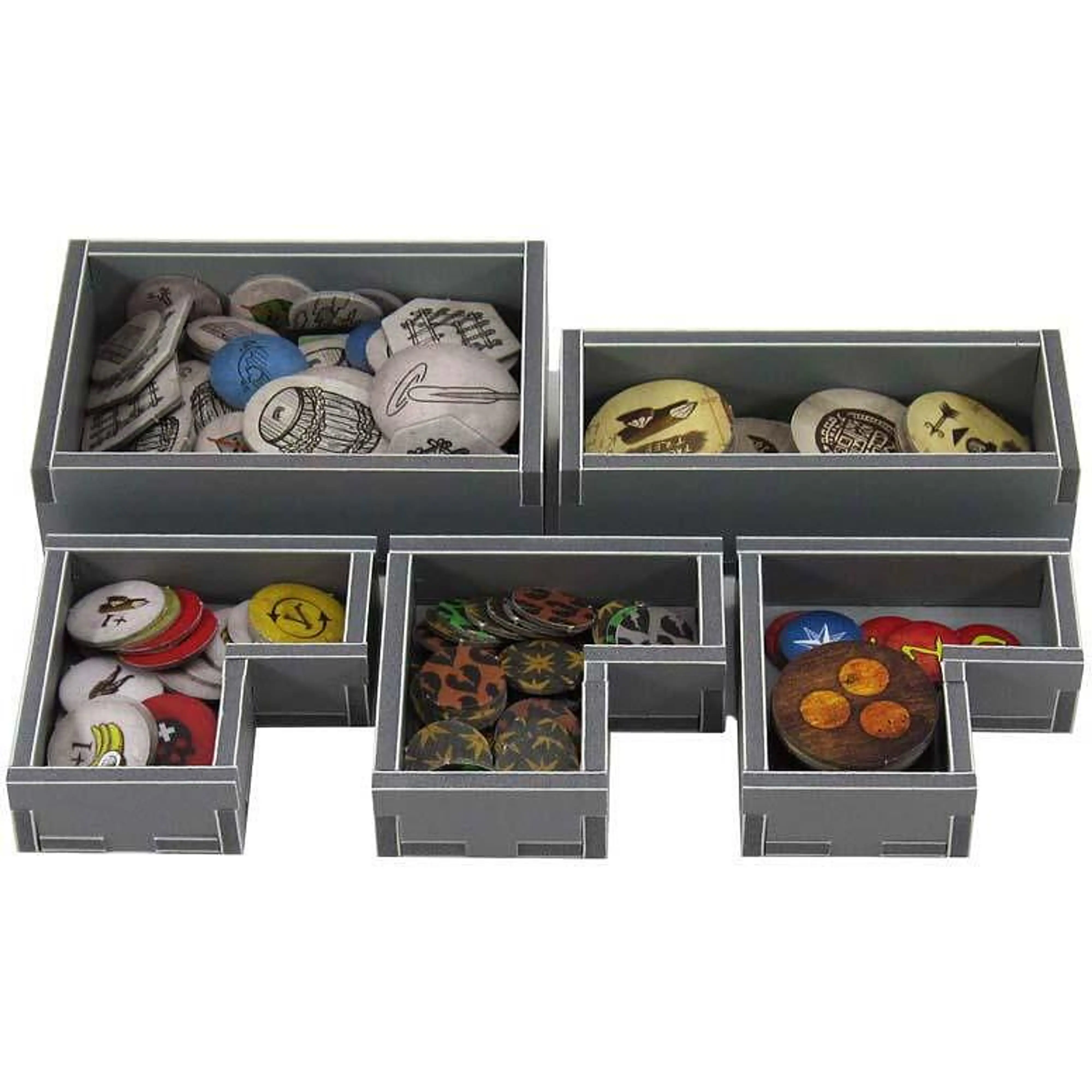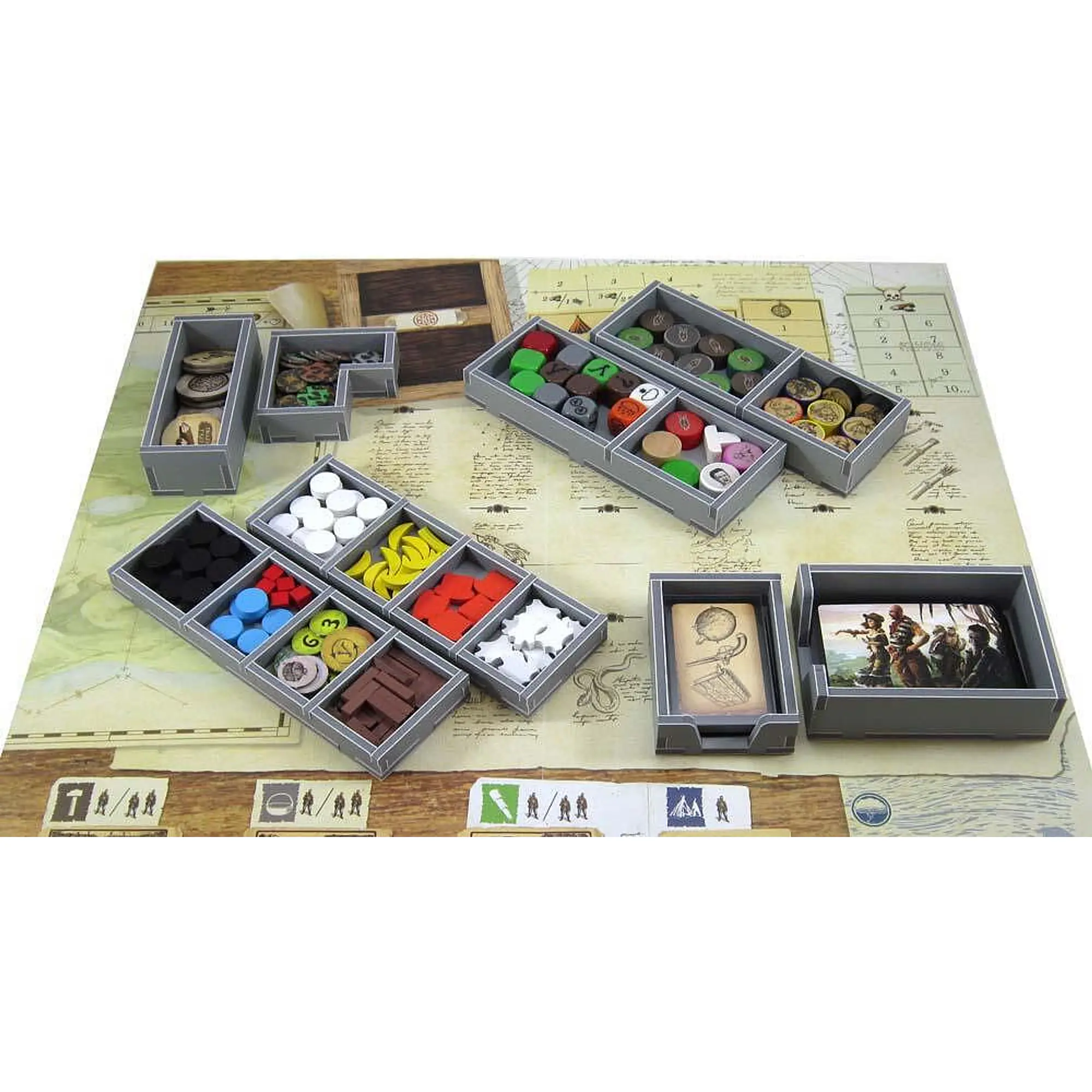 Vstavek je razporejen v do dve plasti, kot je prikazano. Opozoriti je treba, da so otoške šestkotne ploščice in žeton prvega igralca shranjeni med drugimi predali na dnu slike.