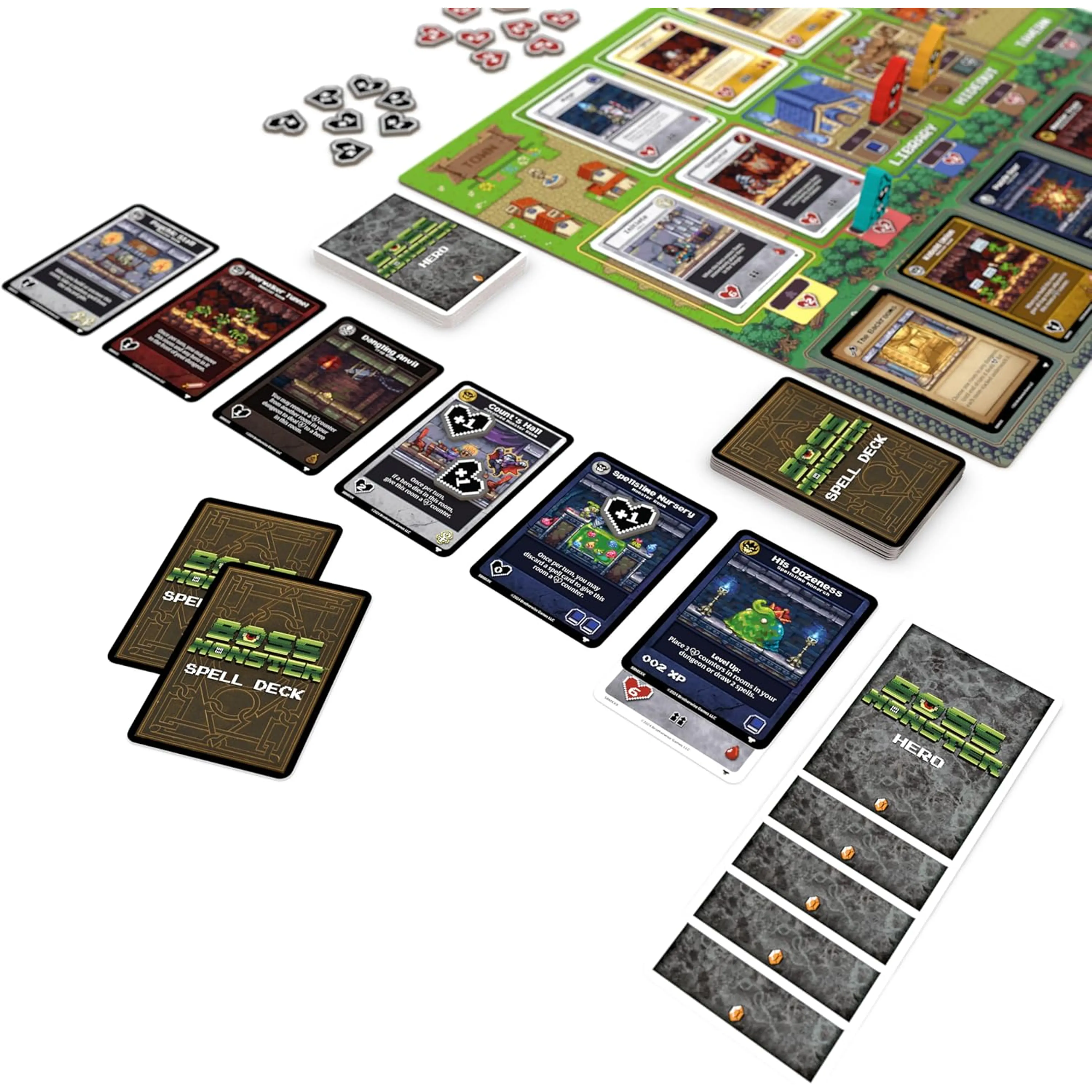 -Minioni (Minion meeples): Igralci lahko pošiljajo svoje minione v mesto, da privabijo junake v svoje ječe ali aktivirajo posebne akcije na tabli mesta, kot je pridobivanje novih kart ali izboljšanje sob.