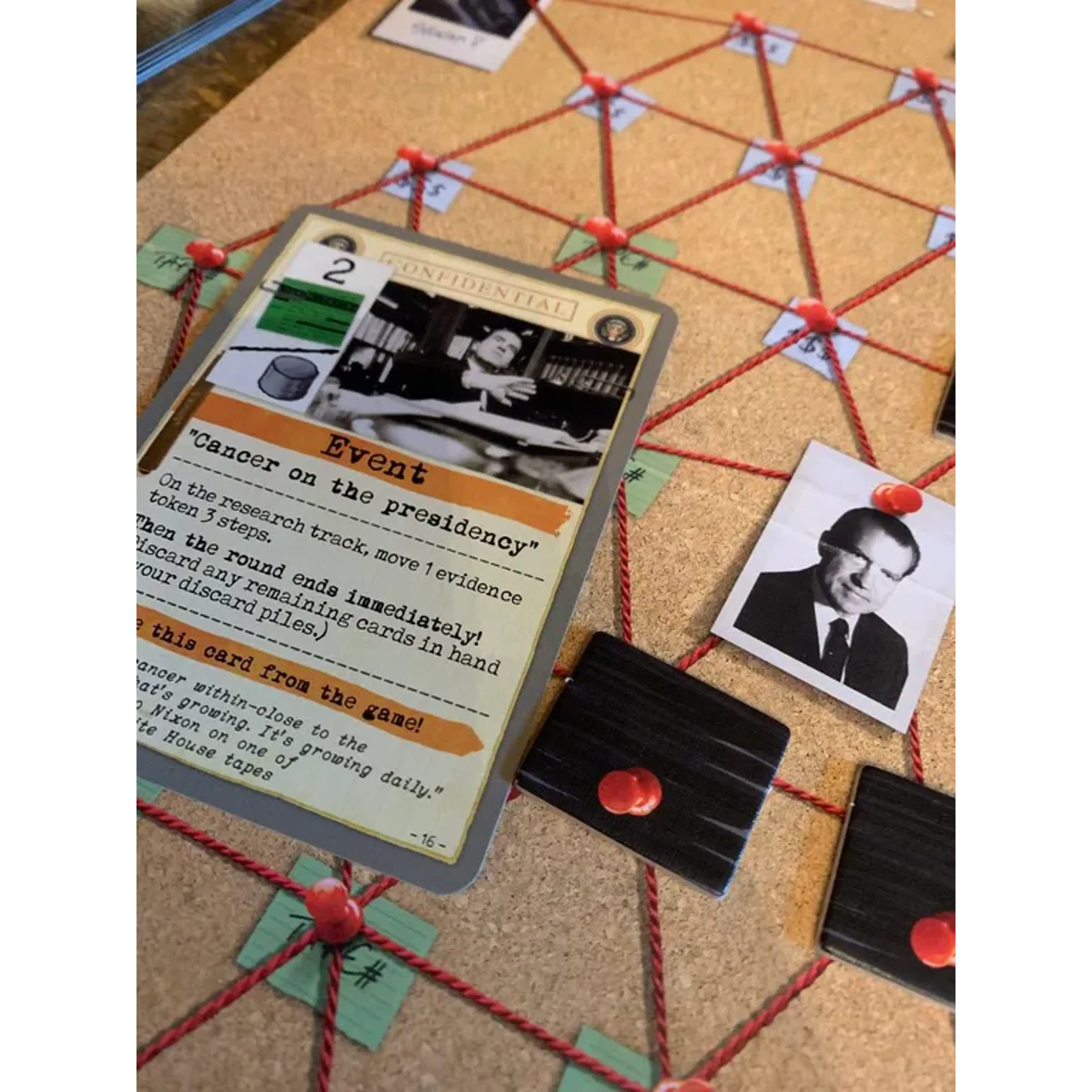 Vsak igralec ima drugačen cilj in drugačne karte. Nixonova stran poskuša blokirati dostop do dokazov, medtem ko novinarji gradijo mrežo povezav. Vsako karto lahko uporabiš za premik žetonov ali za posebno akcijo – a če jo uporabiš za slednje, jo izgubiš za preostanek igre. Žetoni dokazov, iniciative in momentuma se premikajo po igralni plošči kot v igri vlečenja vrvi – vsak igralec poskuša pridobiti nadzor nad ključnimi elementi. Karte predstavljajo resnične osebe iz škandala – novinarje, informatorje, politične figure – kar igri daje dodatno globino.