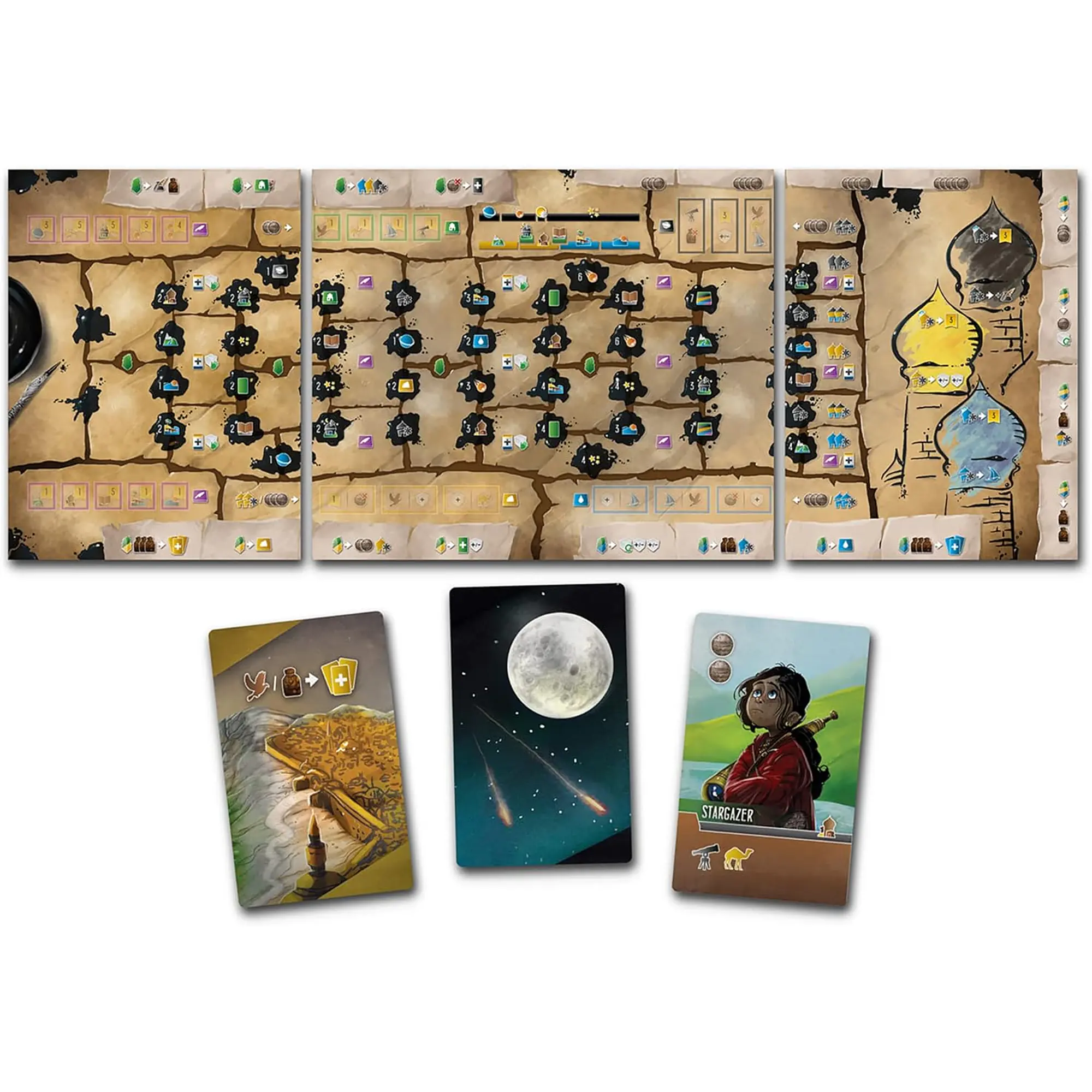 Igralci gradijo svojo osebno mapo z različnimi kartami, ki predstavljajo potovanja po kopnem, morju in nebesih. Kocke predstavljajo delavce, katerih vrednosti in simboli se lahko nadgrajujejo in prilagajajo. Zbira se vire, najema pomočnike in optimizira poteze. Journal track: Napredovanje po "stezi znanja", kjer pravilno tempiranje akcij prinaša pomembne bonuse. Več poti do zmage - igralci lahko izbirajo med znanstvenim napredkom, ekonomskim razvojem ali širjenjem raziskav.