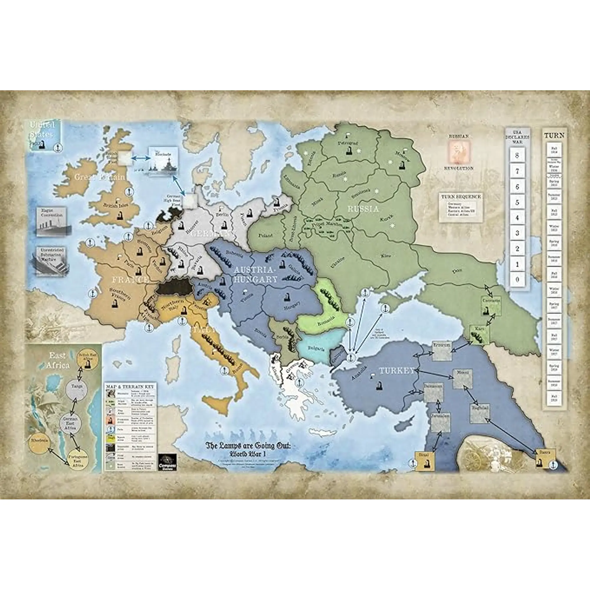 The Lamps are Going Out: World War I je zgodovinsko-strateška družabna igra, ki vas postavi v turbulentni svet Prve svetovne vojne, kjer se igralci borijo za nadzor nad Evropo in usodo njenih narodov. Kot voditelji velikih evropskih sil – Nemčije, Francije, Velike Britanije in Avstro-Ogrske – morate sprejemati ključne odločitve, ki bodo vplivale na izid vojne in prihodnost celine.